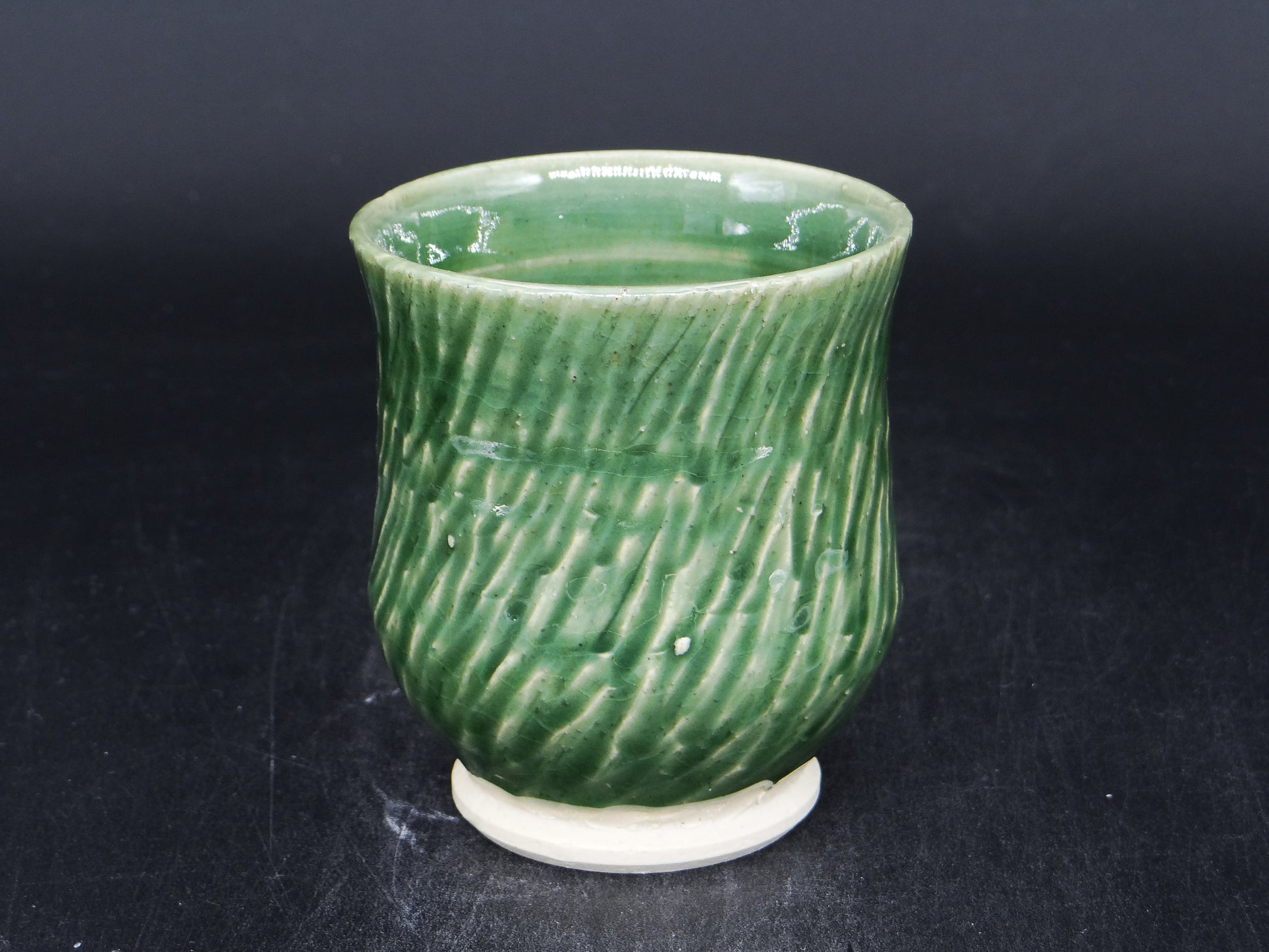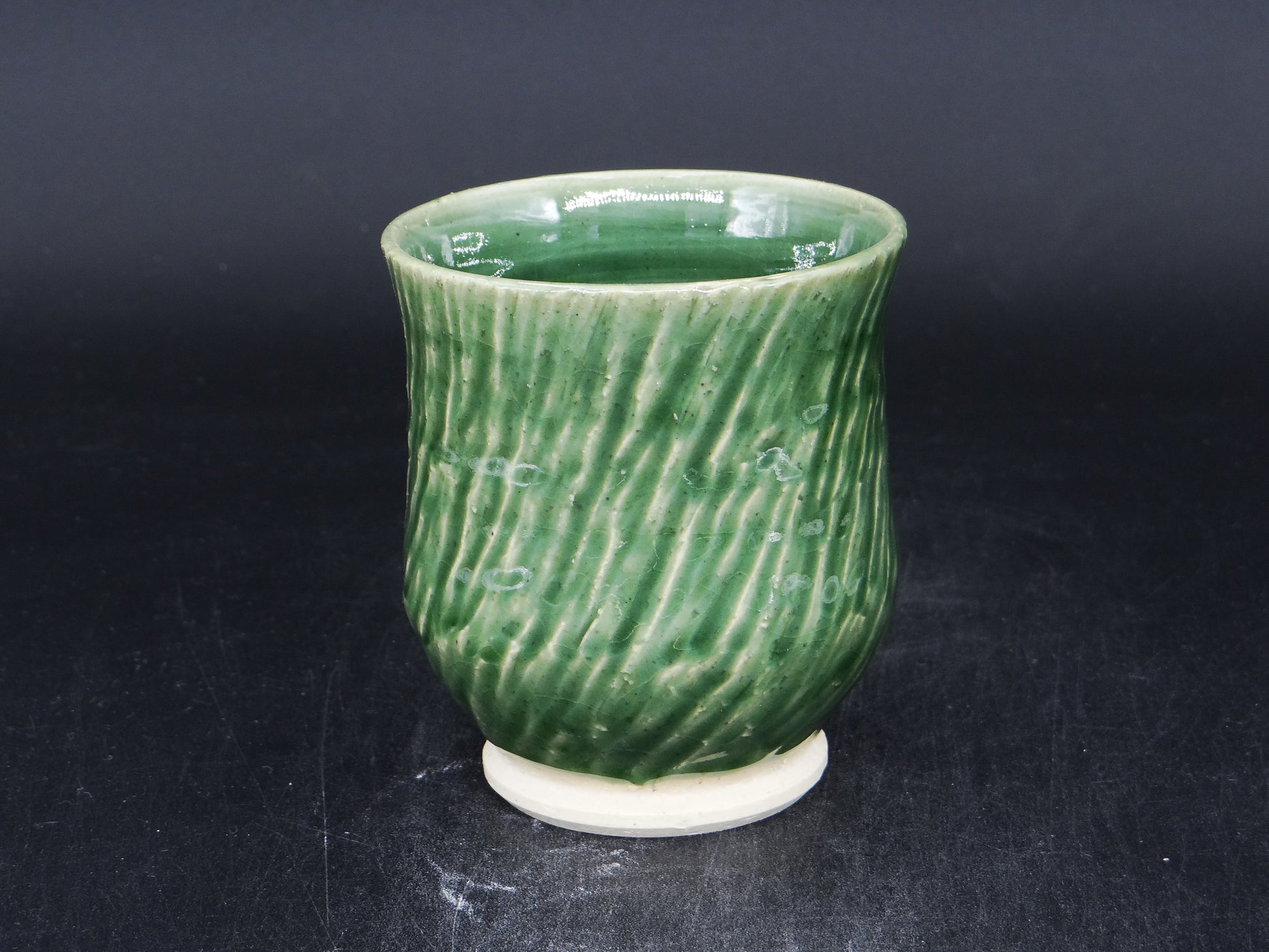 Simple cup with a carved texture on its surface, glazed with a green ash celadon glaze.