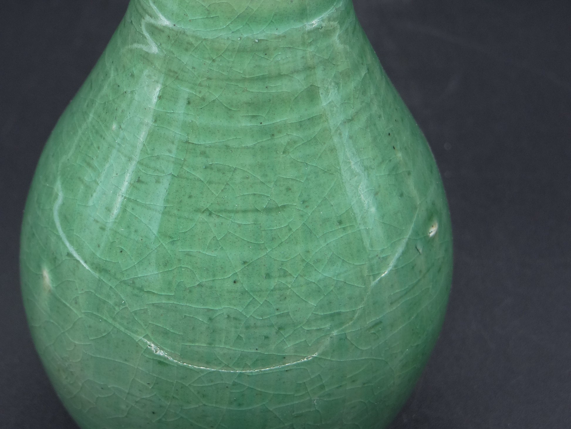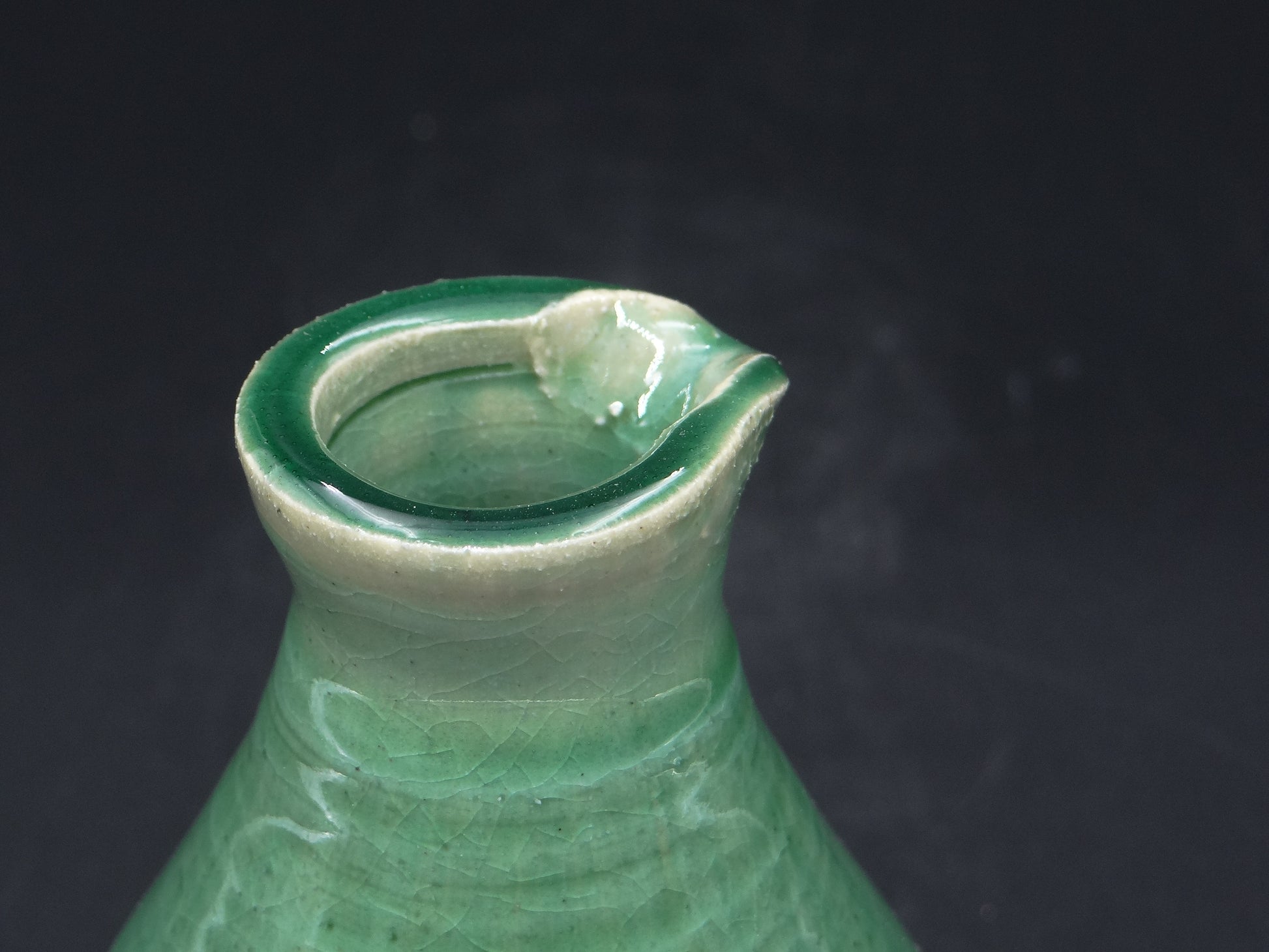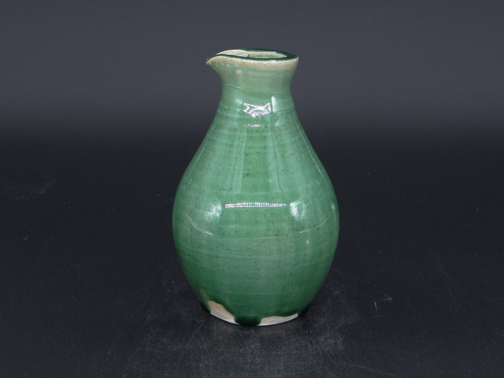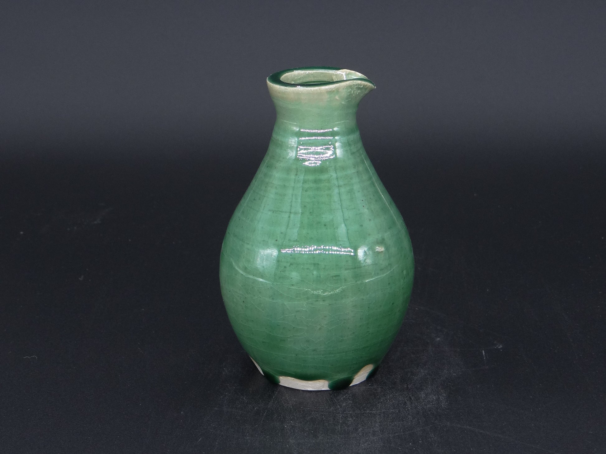 Small pouring bottle for oil or salad dressings. Bottle made with a stoneware clay and glazed with a green ash celadon glaze.