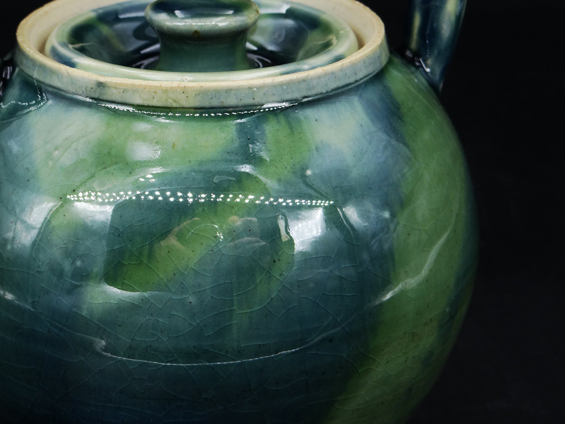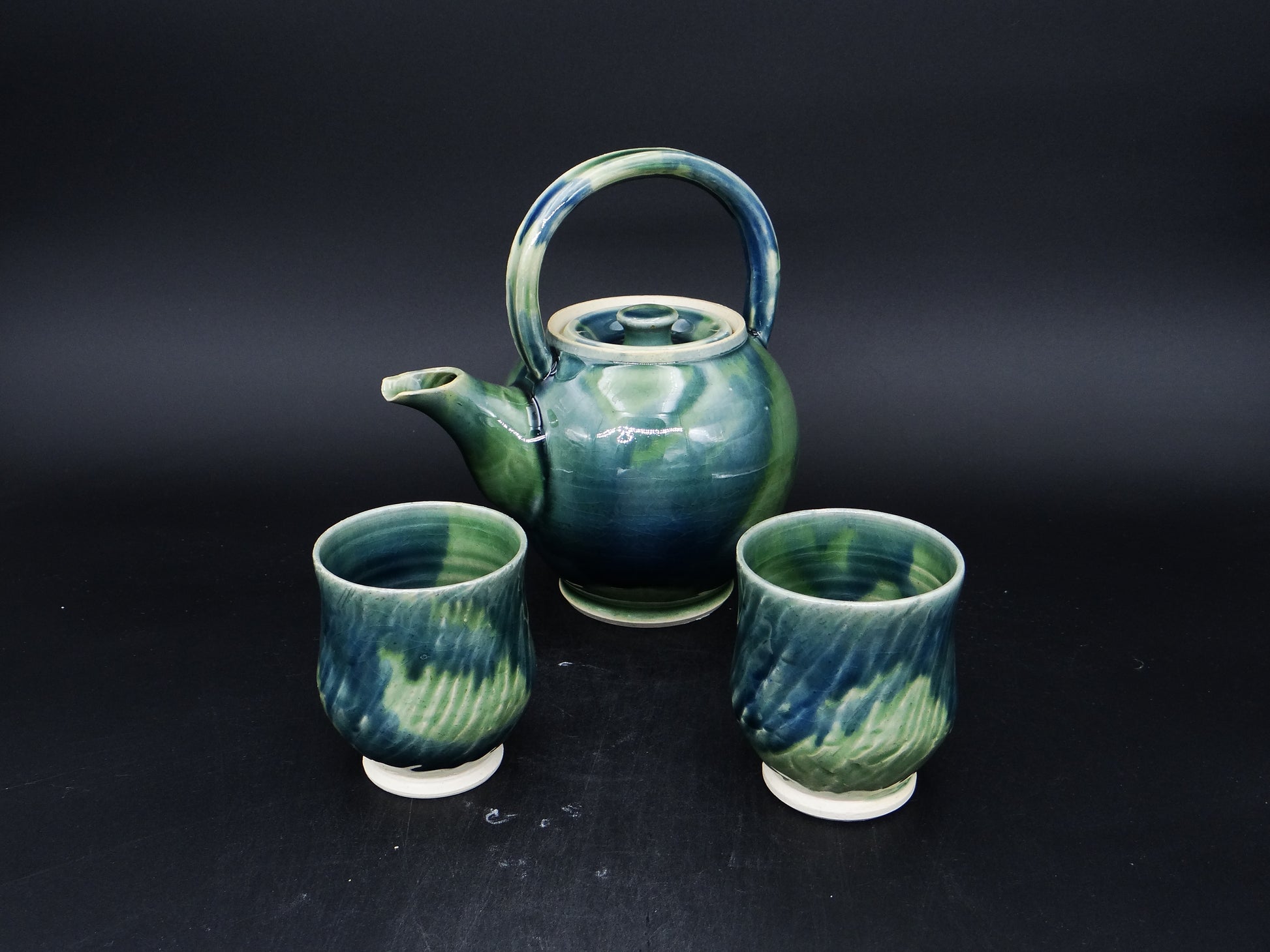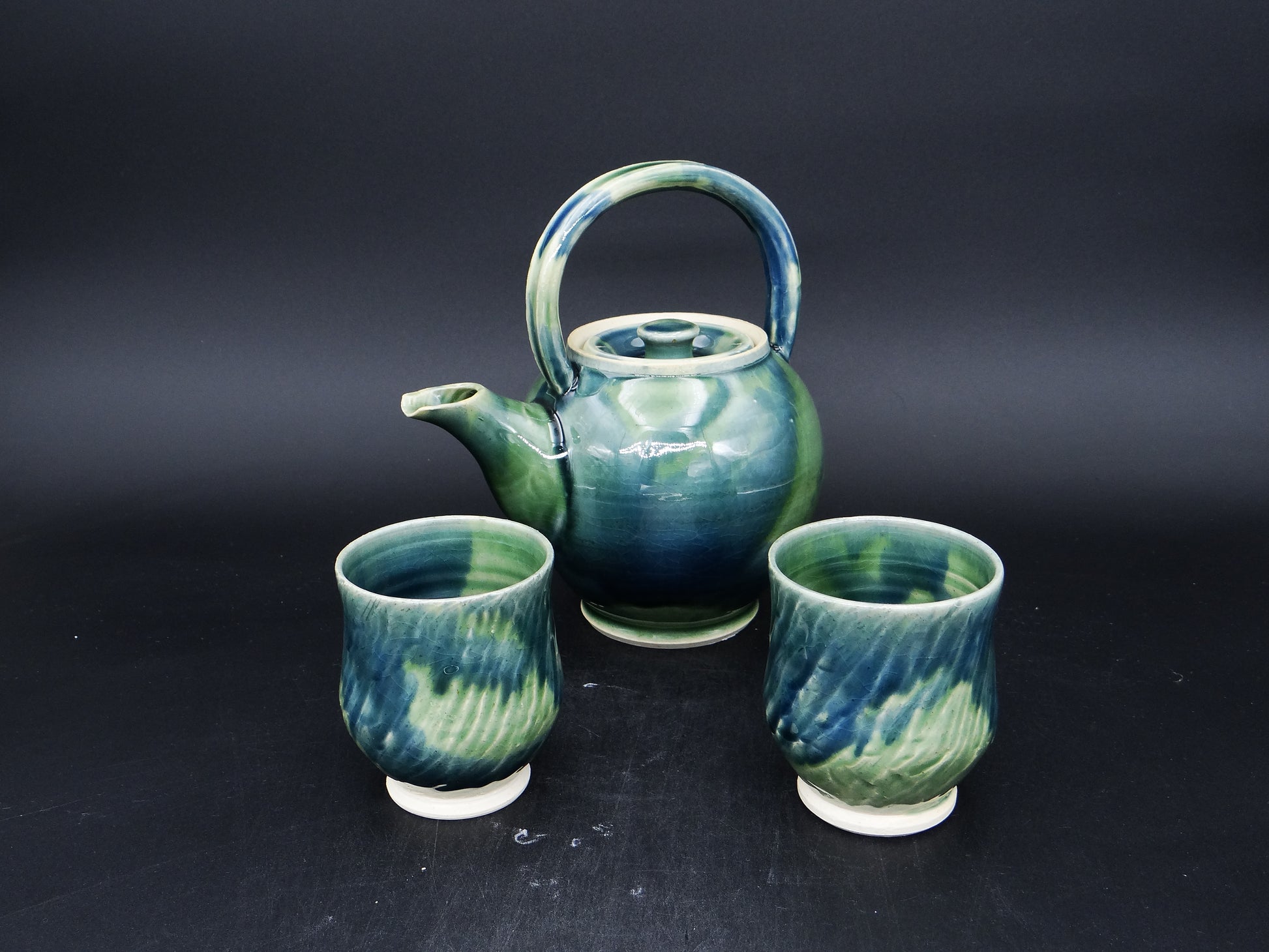Handmade Tea set which includes a teapot and 2 matching tea cups, glazed with a blue ash celadon and a green ash celadon glaze which have been layered on top of each other to have color variation across the pieces' surfaces.