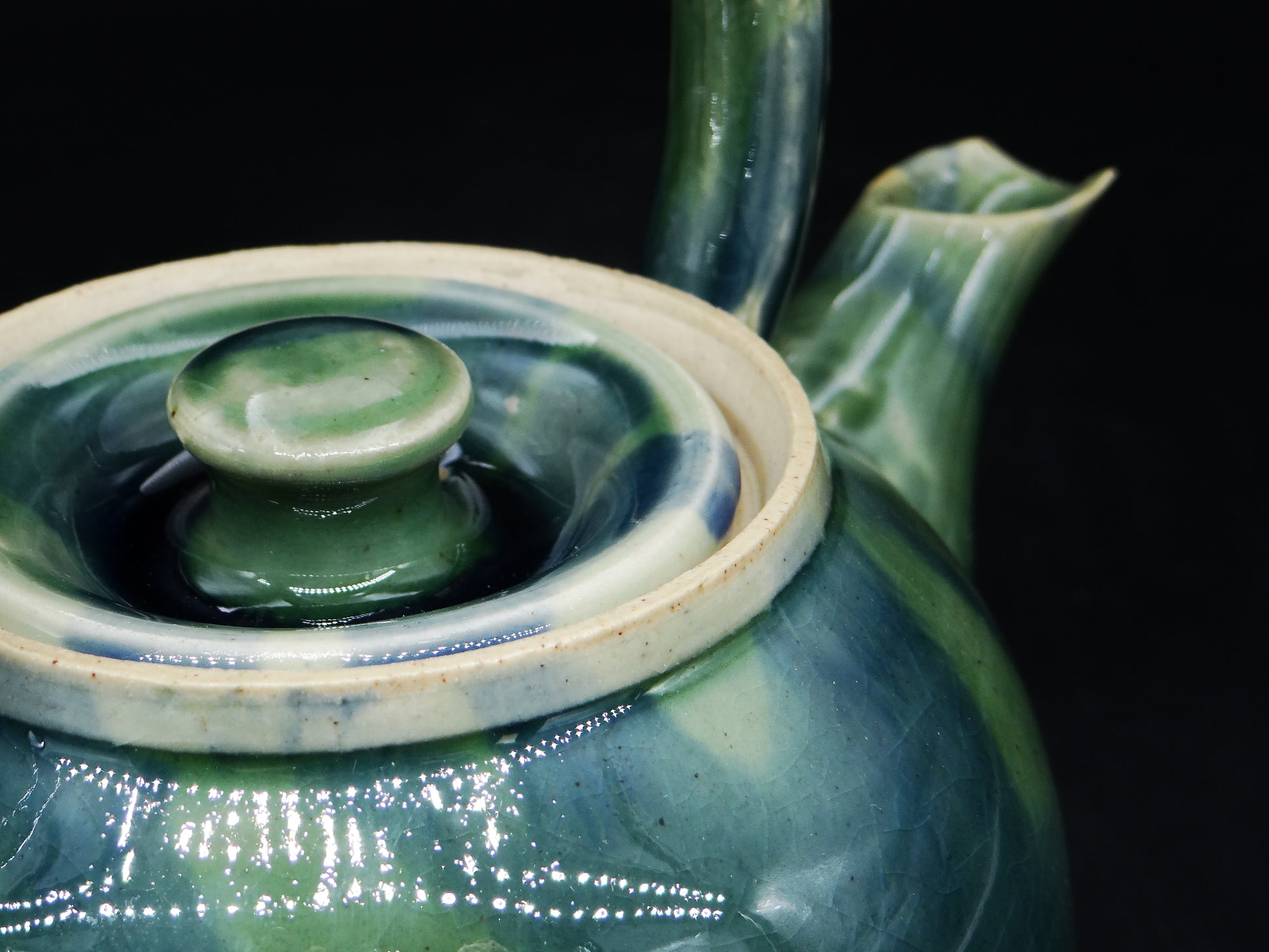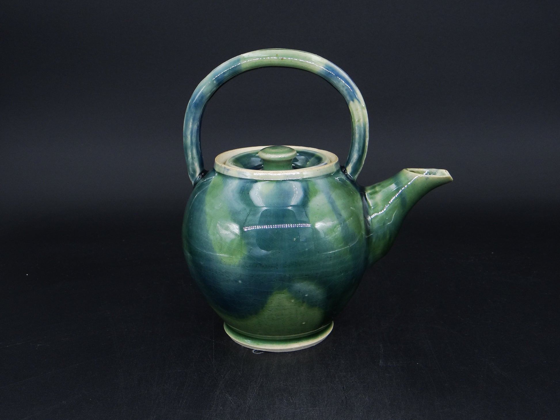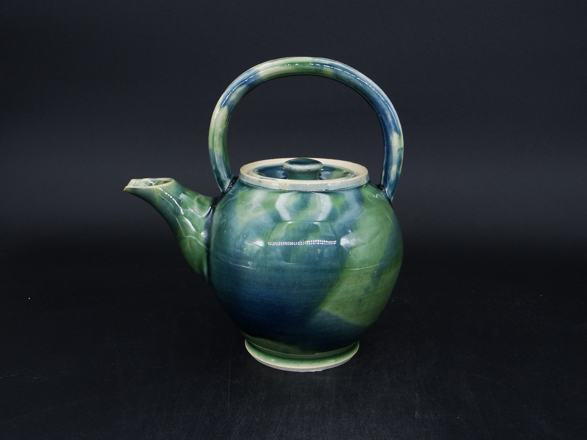 Handmade Tea set which includes a teapot and 2 matching tea cups, glazed with a blue ash celadon and a green ash celadon glaze which have been layered on top of each other to have color variation across the pieces' surfaces.